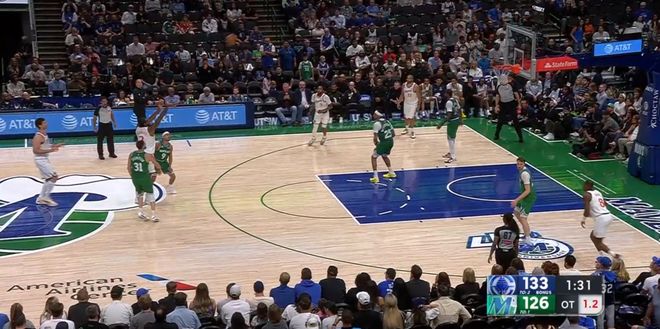 ——剩下1分30秒前,伦纳德差点丢球,然后投进了一记高难度压哨三分