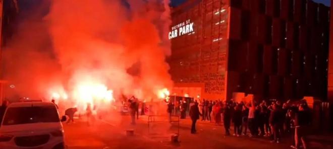 - 开始炸街,大量加拉塔萨雷球迷在利物浦街头燃放焰火